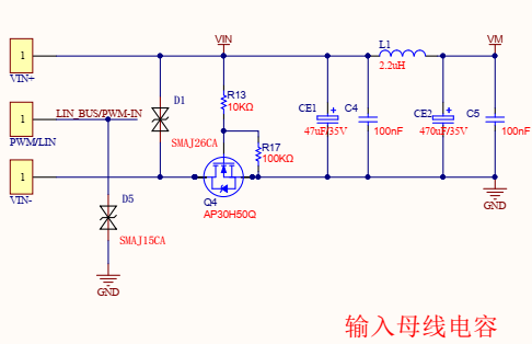 輸入通過N管,實(shí)現(xiàn)防反功能。使用CE1、L1和CE2,構(gòu)成π型濾波。能有效減少電源的干擾。