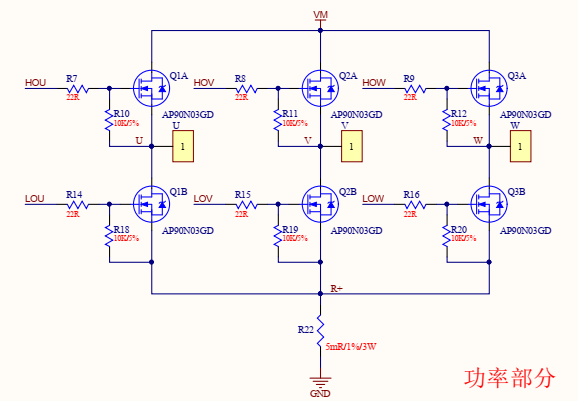 功率橋電路采用上下管均為NMOS的配置,總計6個NMOS組成三相H半橋驅(qū)動電路。