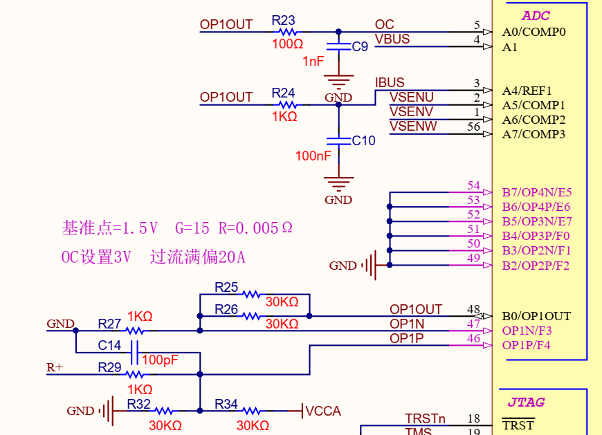 通過內(nèi)部獨(dú)立運(yùn)放OP1組進(jìn)行差分運(yùn)放15倍,送到A0口用做過流保護(hù),送到A4口進(jìn)行恒功率控制。
