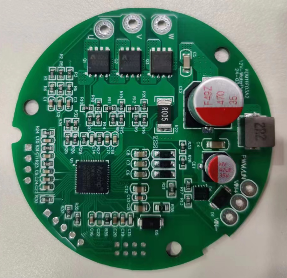 電路模塊主要包括: 輸入防反母線電容輸入部分、ADM16F03A2最小系統(tǒng)、功率橋電路、ADC母線采樣電路、單電阻采樣運(yùn)放采樣電路、自舉電路和PWM/LIN通訊反饋電路。