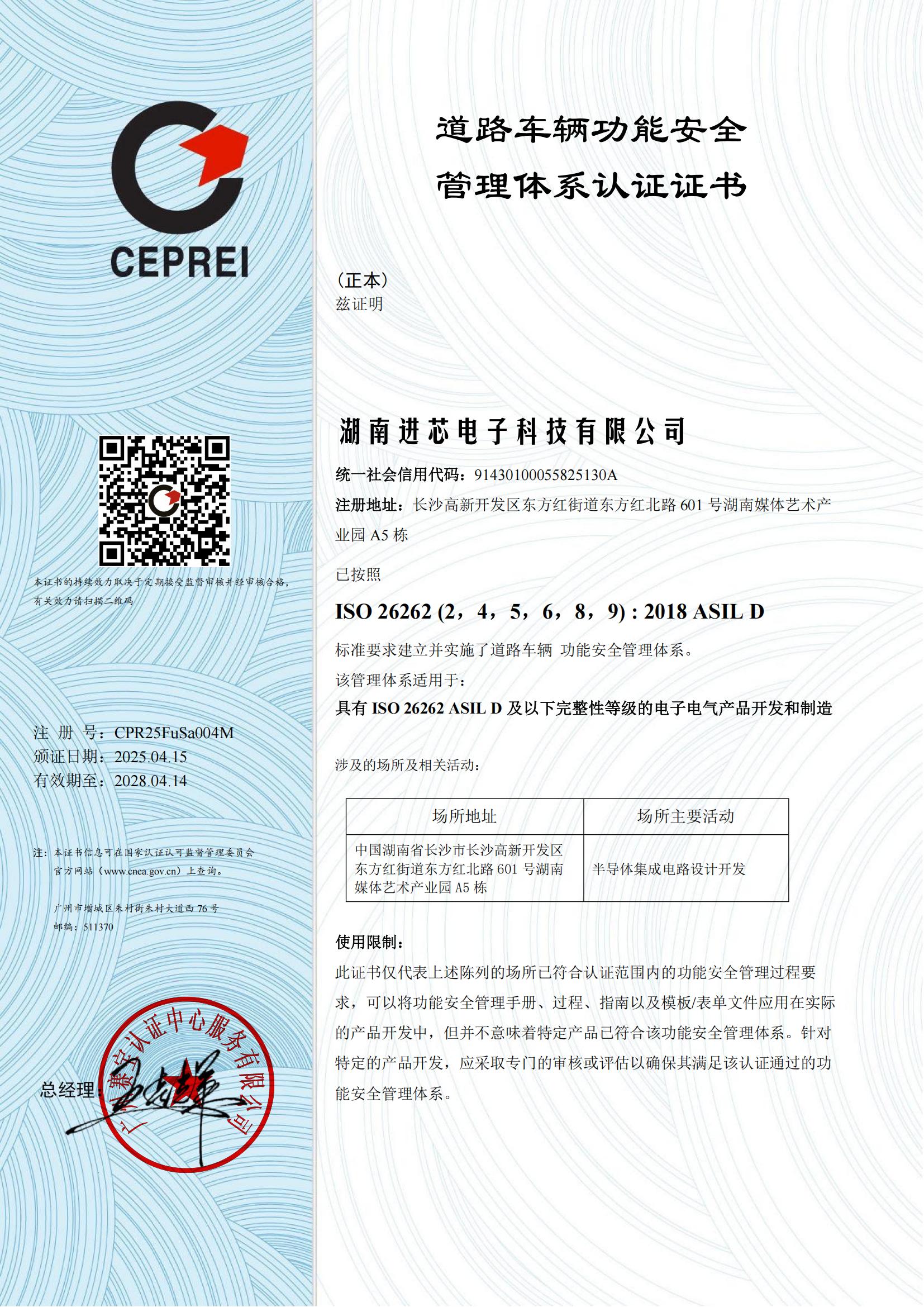 喜報!進芯電子通過ISO 26262 道路車輛功能安全管理體系認證