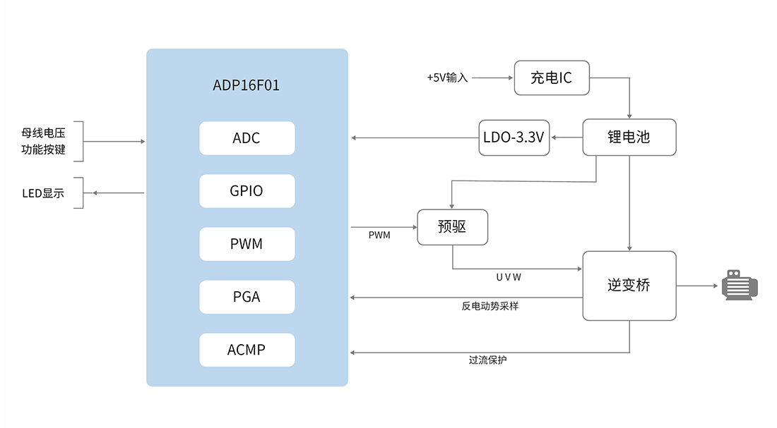 本方案是基于進芯16位DSP ADP16F01開發(fā)的,充分發(fā)揮了ADP16F01的算力、資源、成本等優(yōu)勢。整個系統(tǒng)結(jié)構(gòu)簡單,采用無感方波控制算法,能夠?qū)崿F(xiàn)筋膜槍的穩(wěn)定啟動和運行,通過設置不同的限流點可以實現(xiàn)對的力道大小的調(diào)節(jié);擁有堵轉(zhuǎn)卸力,快速充電,動力強勁等功能。