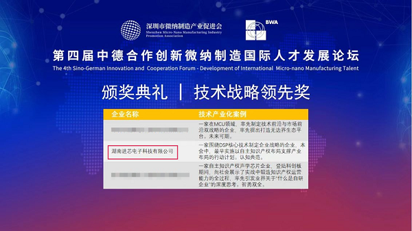 1月6日,由深圳市微納制造產(chǎn)業(yè)促進會、德國聯(lián)邦經(jīng)濟發(fā)展和對外貿(mào)易聯(lián)合總會(BWA)聯(lián)合主辦,西麗湖人才服務(wù)中心承辦的“第四屆中德合作創(chuàng)新微納制造國際人才發(fā)展論壇”于深圳順利舉行,論壇圍繞微納制造技術(shù)產(chǎn)業(yè)化、國際合作、科創(chuàng)人才發(fā)展等話題進行了演講和探討。在“微納制造技術(shù)產(chǎn)業(yè)化優(yōu)秀案例評選”中,進芯電子榮獲“技術(shù)戰(zhàn)略領(lǐng)先獎”。