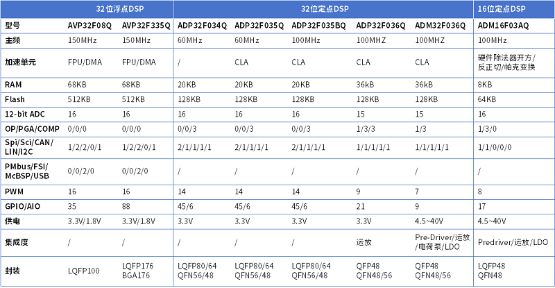 針對以上需求,進芯電子經(jīng)過多年深耕,推出了符合IATF16949,AEC-Q100 Grade1標準的強大產品陣容,包括:32位浮點高性能DSP芯片AVP32F335系列,32位定點實時控制DSP芯片ADP32F034、ADP32F035系列,32位定點車身控制DSP芯片ADP32F036、ADM32F036系列, 16位定點高性價比DSP芯片ADM16F03系列;全面匹配電動汽車從動力域到車身域的多種應用。進芯產品憑借其優(yōu)異性能獲得OEM廠商的認可,已實現(xiàn)商用量產,并提供長期供貨保證。