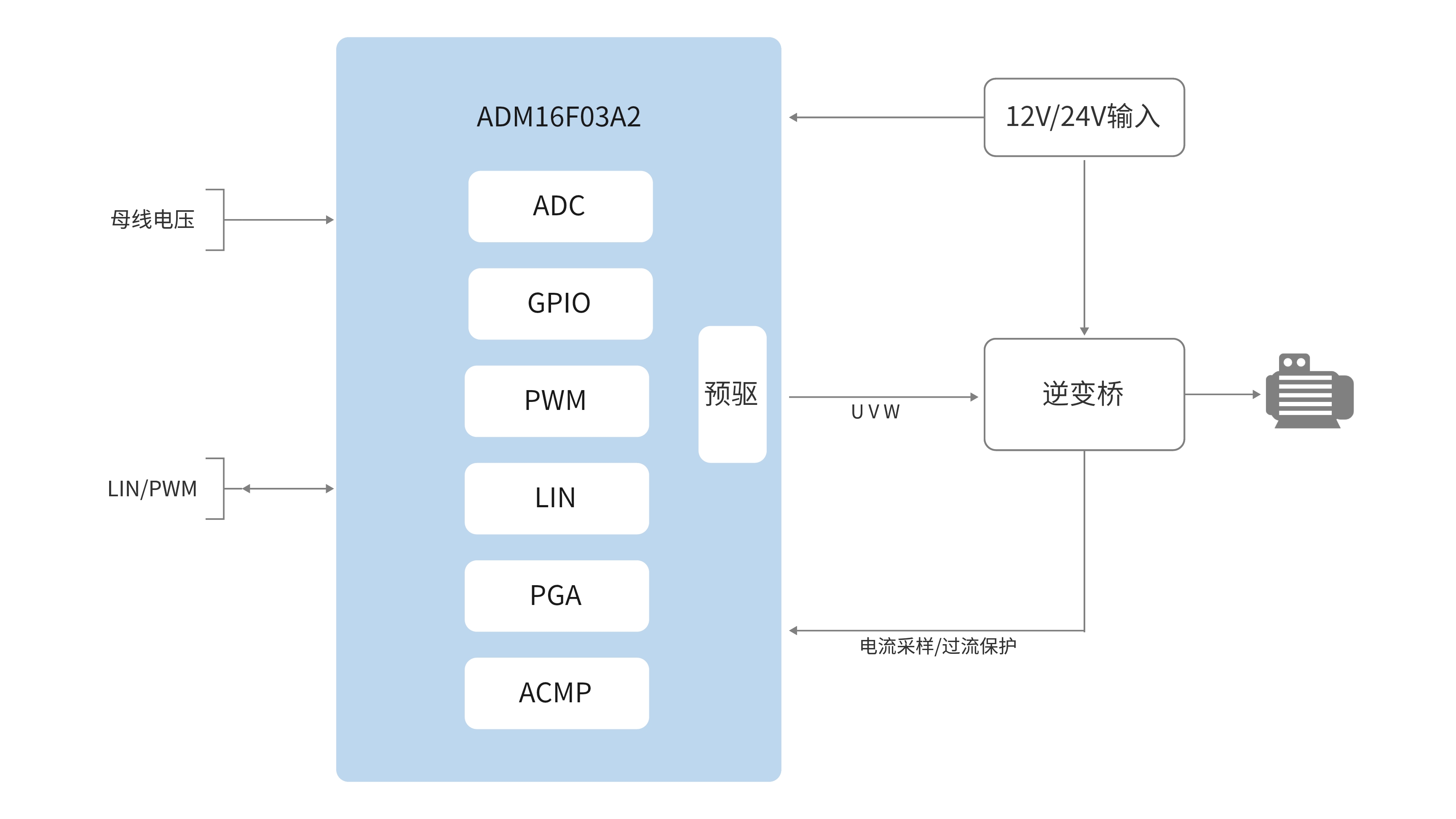 該方案采用自研無感單電阻FOC算法,具備母線電壓ADC檢測,可通過PWM/LIN進(jìn)行控制不同的轉(zhuǎn)速及故障反饋功能;具有順逆風(fēng)啟動(dòng),噪聲小,波形控制穩(wěn)定等特點(diǎn)